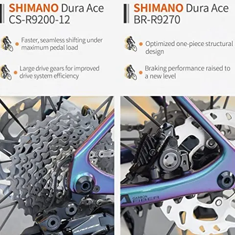 - 🚴【SHIMANO DURA ACE Di2 GROUPSET】- SAVADECK electronic shifting road bike with DURA ACE Di2 R9270 groupset 2*12 speed disc brake, ST-9270 dual shifting levers, FC-R9200 crankset, FD-9250 front derailleur and RD-9250 rear derailleur, small Di2 mechanism units precisely control the movement of each derailleur, the powerful lightweight motor provides flawless performance in all conditions and on all terrains.