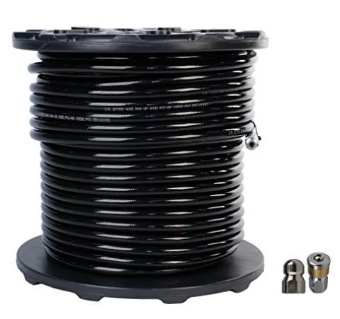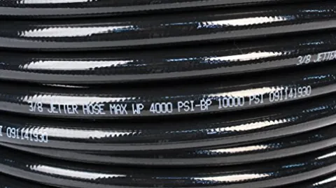 The Schieffer 3/8in. x 300ft. 4000 PSI Thermoplastic Sewer Jetter Hose is engineered for superior performance and durability, making it an essential tool for effective drain cleaning. Featuring a robust construction with an extra strong layer of textile braid and a high tenacity polyester layer, this hose is built to withstand high pressure while providing flexibility and resilience. Its 3/8″ MPT connections ensure a secure fit, while the included button nose and rotating stainless steel nozzles efficiently clear blockages in various pipe sizes. ISO 9001 certified and proudly made in the USA, this hose combines quality craftsmanship with exceptional functionality, ensuring you tackle even the toughest sewer challenges with ease.