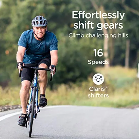 - Shimano Claris 16-speed drivetrain with Schwinn 50/34T compact crank and Claris shifters, and Sunrace 11-34T cassette