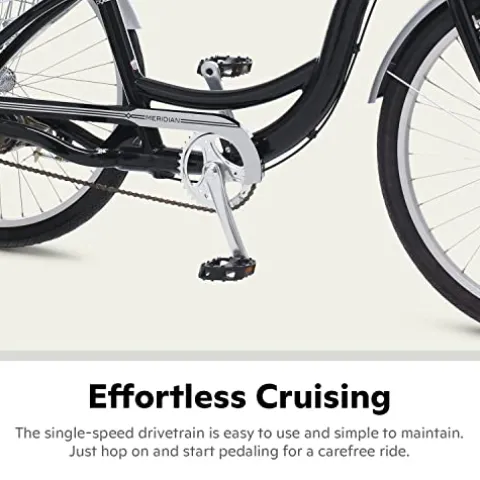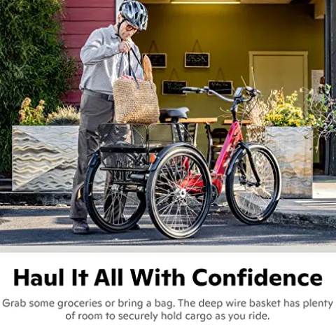 Experience the ultimate in comfort and convenience with the Schwinn Meridian Adult Tricycle Bike in sleek black. This three-wheel beach cruiser features a low step-through frame and a wide seat for easy mounting and comfortable riding. Equipped with 26-inch wheels, a front V-brake, and rear band brake, this single-speed trike offers versatile stopping power for riders between 5’4″ to 6’2″ in height, with a recommended weight limit of 300 pounds. The redesigned rear folding basket securely holds up to 44 pounds of cargo and conveniently folds flat for storage. Enjoy a stable and balanced ride with wide handlebars, an extra-large cruiser saddle, and full coverage fenders for style and protection. Perfect for older riders, those with limited mobility, or anyone seeking a confidence-inspiring ride, this adult tricycle combines strength, stability, and style for your cycling adventures.