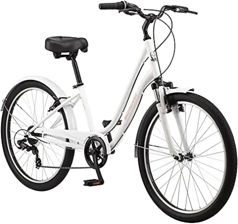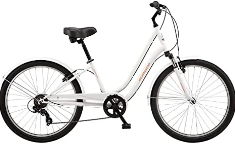 Experience the ultimate comfort and style with the Schwinn Regioneer Women’s Hybrid Comfort Bike. Designed with a sturdy RPG steel frame and suspension fork, this bike offers an upright riding position ideal for leisurely neighborhood rides. The Shimano 7-speed Revo shifter and derailleur ensure smooth gear transitions, while the front and rear alloy linear pull brakes provide reliable stopping power. Lightweight alloy rims and 2.125-inch comfort tires contribute to a smooth and comfortable ride. With its sleek white color and top-notch features, this Schwinn bike is a perfect blend of performance and aesthetics.