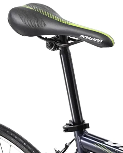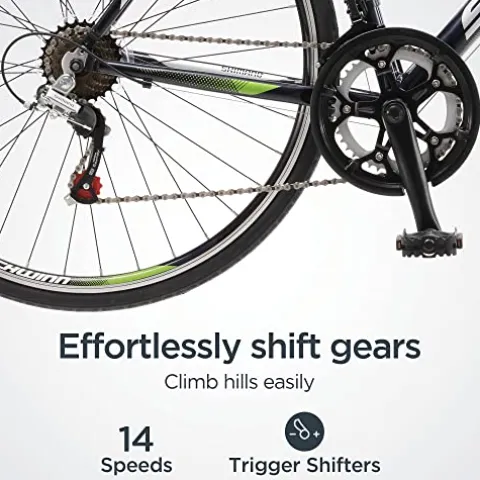 The Schwinn Volare 1300 Drop Style Hybrid Sports Road Bike offers a quick and agile riding experience with its 21-inch aluminum fitness frame and rigid fork, perfectly complemented by 700c wheels suitable for riders between 5’4″ to 6’2″ in height. Its Shimano 14-speed A050 shifters and rear derailleur ensure swift and seamless gear changes, while the alloy crank with double chain rings provides optimal gearing for a smooth ride. This road bike features alloy caliper brakes for superior braking performance and a drop style handlebar with a sport saddle for added comfort. With high profile double-wall alloy rims for durability, this hybrid bike comes partially assembled and requires basic tools for completion.