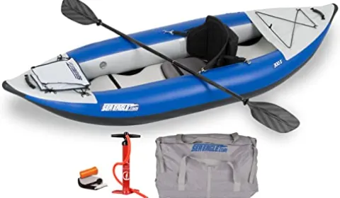 Conquer both whitewater rapids and calm lakes with the Sea Eagle SE300X Explorer Inflatable Kayak, Pro Package. This durable kayak from Sea Eagle is designed to withstand class four whitewater while remaining stable and comfortable in flat-water conditions. The self-bailing feature with 16 floor drains allows for versatile use in wet conditions or sealed for dry paddling. Enhanced tracking on open water is achieved with the removable slide skeg. Whether you’re fishing, touring, camping, or adventuring, this kayak ensures an exciting and enjoyable experience every time.