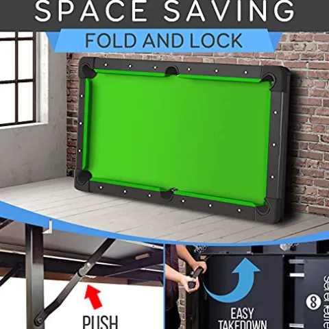 - LOCKING MECHANISM: This foldable pool table is equipped with leg leveling adjustment & locking leg safety mechanism to ensure a fun filled game without any worry. The locking feature keeps it sturdy and prevents the table from sliding while you play