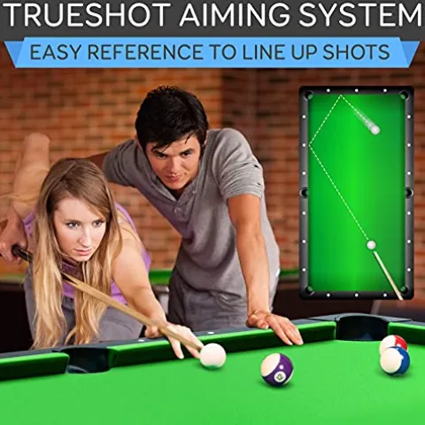 - TRUESHOT AIMING SYSTEM: Equipped w/ trueshot aiming system which includes 18 aiming points that help you line up your shots. Perfect for beginners & intermediate players. Includes 6 foot pool table, billiard balls, cues, brush, ball triangle & chalks