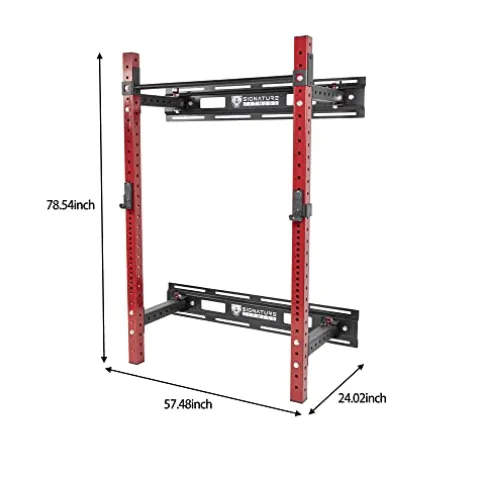 Enhance your home gym with the Signature Fitness 3” x 3” Wall Mounted Fold-in Power Cage Squat Rack. This space-saving rack mounts easily on any wall and can be collapsed when not in use. The adjustable J-Hooks and Safety Spotter arms provide versatility, with 47 vertical holes and “westside” spacing for a customized fit during bench presses. Crafted from 3″x3″ 11-gauge steel, this rack offers maximum stability and durability, accommodating weights of up to 1,000lbs. The UHMW-coated J-Hooks and adjustable height pull up bar add to the functionality of this sleek red-colored home gym essential.