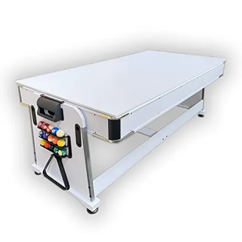 Enhance your game room with the Pool Table 7FT Multigame Blue Air Hockey + Table Tennis + Table Top – Polar by SIMBASHOPPING USA. This versatile 7 feet multi-game table in white with blue cloth offers the excitement of billiards, air hockey, and table tennis all in one. Easily switch between games by turning the table, allowing you to enjoy different activities without taking up extra space. Complete with all accessories, this table is not only solid and robust but also serves as a stylish dining table when covered with the top panel. Upgrade your entertainment options with this all-in-one gaming solution.