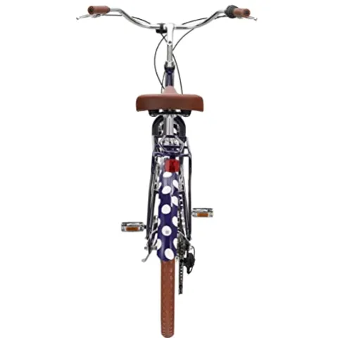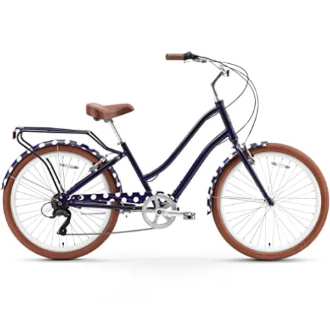 The sixthreezero A/O Frida Limited 7-Speed Step-Through Touring Hybrid Bicycle in Navy & White Spots is a versatile hybrid bike designed for women. With its 17.5-inch swooping step-through aluminum frame, this bike is perfect for leisurely cruises, daily commutes, and varied terrain rides. The comfortable and ergonomic design includes a soft foam seat, ergonomic handlebar grips, and an upright riding position to keep you comfortable on the go. Its 7-speed internal hub allows for easy handling of longer distances and moderate hills, while the front handbrake and rear coaster brake ensure precise stops. This stylish bike features a dual-spring saddle, matching fenders, and a rear rack for optional accessories. The quality whitewall semi-slick tires provide a stable and cushioned ride, making it a perfect choice for any cycling adventure.