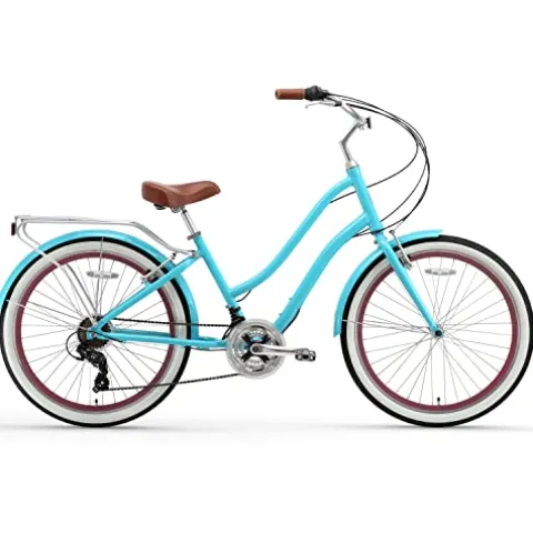 Experience the perfect blend of style and functionality with the sixthreezero EVRYjourney Women’s 21-Speed Step-Through Hybrid Cruiser Bicycle. This versatile cruiser features a 17.5-inch swooping step-through aluminum frame in a stunning teal color with a brown seat and grips. Designed for cruise, leisure, and commute rides, it offers an upright riding style that keeps your back and shoulders comfortable, while the foot-forward design helps maintain proper leg extension. Equipped with a 21-speed Shimano Tourney derailleur and friction shifters, this bike is ideal for tackling uphill climbs and long distances with ease. The stylish frame, dual-spring saddle, matching fenders, and rear rack for optional baskets and panniers make this bicycle both practical and chic. Complete with 26-inch whitewall semi-slick tires, enjoy a cushioned and stable ride wherever the road takes you.