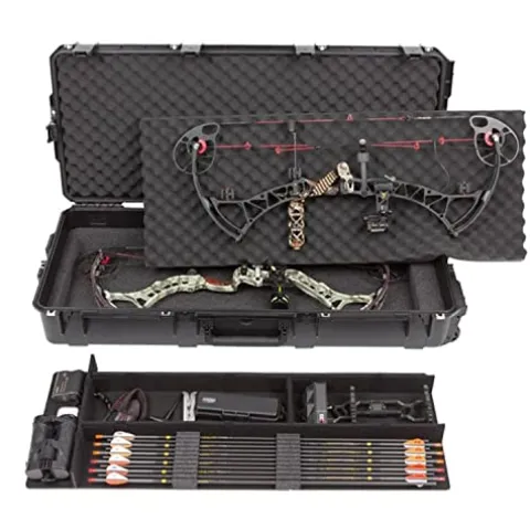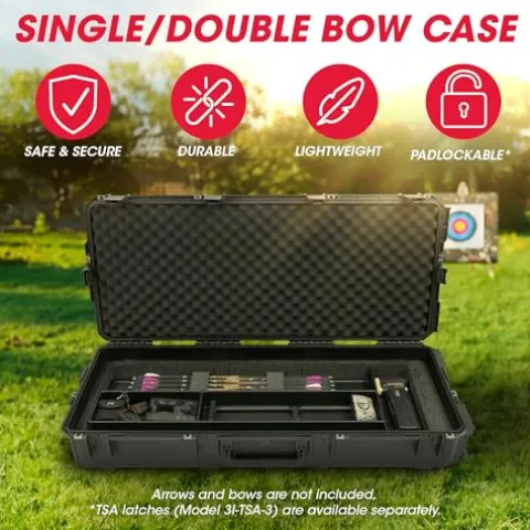 The SKB iSeries Compact Ultimate Hard Exterior Waterproof Bow Case is expertly designed for the serious hunter, accommodating two bows—one up to 42 inches and the other up to 40 inches—while providing superior protection with its rigid bunk-bed padding. The interior features a spacious accessory tray that securely holds up to 11 arrows, ensuring all your gear is organized and accessible. Engineered with a waterproof and dust-tight design, this case also includes cushion grip handles and in-line skate wheels for effortless transport. For added peace of mind, the Trigger Latch System can be upgraded with TSA-approved locks, while stainless steel padlock protector clips enhance security. With dimensions tailored for functionality and durability, this bow case is the ultimate companion for your hunting adventures.
