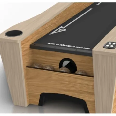 Experience the excitement of the arcade right in your own home with the Skee-Ball Arcade Table Machine Game in Coal color. This premium+ game offers six fun modes for up to six players, with color-changing lights adding to the thrill of the competition. Crafted with natural hardwood maple rails, a cupholder, and durable rubber targets, this game features a classic lit playfield and a digital LED pixel display for vibrant visuals. Made in the USA and running on a standard 110v wall outlet, this Skee-Ball Arcade Table Machine promises hours of nostalgic fun for family and friends alike.