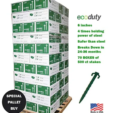 Secure your landscaping projects with the Contractor Grade 6 Inch Biodegradable Stakes from Smart Spring. Designed for durability, these premium heavy-duty stakes offer five times the holding power of traditional metal options, ensuring your weed fabric, landscape fabric, netting, and blankets stay firmly in place. Crafted from eco-friendly materials, these green stakes biodegrade over time, eliminating the risk of rust and hazardous metal in your yard. Proudly made in the USA, this full pallet includes 70 boxes of 500 stakes each, making it an ideal choice for contractors and DIY enthusiasts alike who prioritize sustainability and strength in their landscaping solutions.