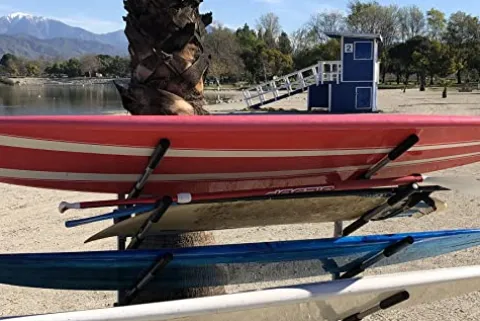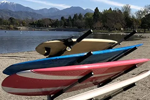 - Freestanding storage system and display for (4) standup paddleboards or surfboards