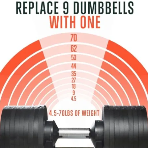 - PREMIUM BUILD QUALITY: Adjust weights from 4.5, 9, 18, 27, 35, 44, 53, 62, and 70 lbs pounds. Includes dumbbell stands. Makes switching weights easy. get a full gym experience!