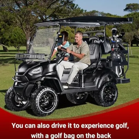 The StandbyMe Golf Cart is a versatile and powerful 4-seat electric buggy equipped with a robust 5000-Watt motor and a built-in 48V battery. Perfect for golfing, hunting, exploring scenic spots, navigating hotels, beaches, schools, and farms, this sleek black cart from StandbyMe ensures a smooth and efficient ride. Ideal for various outdoor activities, this golf utility buggy offers convenience and reliability in one stylish package.
