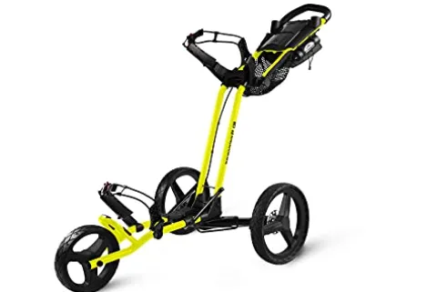 The Sun Mountain Golf Pathfinder PX3 3 Wheel Push Cart in Atomic Yellow is a must-have for golf enthusiasts. This push cart features an accessory console designed to conveniently hold your cell phone, score card, extra balls, and tees. The cell phone holder even includes a slot for a charging plug. With a mesh basket for extra storage, adjustable bungee cords on the bag brackets, and a tracking system for easy adjustments, this push cart combines functionality with style on the golf course.