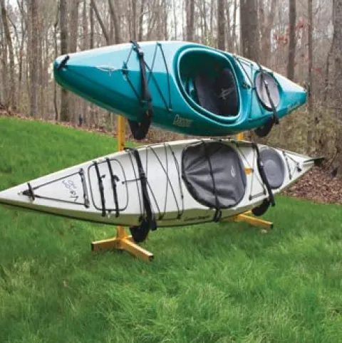 - This powder coated steel frame holds 2 kayaks, canoes or SUPs up to 175 lbs total.