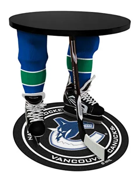 The Team Tables Vancouver Hockey Table with Black Table Top and Vancouver Puck Mat is a must-have for any sports enthusiast. Made with premium materials including a high-grade aluminum cast hockey stick and steel legs, this table is not only a great piece of sports memorabilia but also a durable and eye-catching addition to any room. Proudly crafted in North America, this table features real skates, foam molded hockey legs, and an officially licensed Vancouver puck mat, making it a standout All-Star quality item. Whether for your sports cave, kids’ room, office, or vacation home, this versatile table can be used as an end table, nightstand, accent table, or side table, adding a touch of sports-inspired flair wherever it goes. With dimensions of 26″ H x 24″ D and weighing 32 lbs, this table is easy to assemble and sure to be the envy of all your friends.
