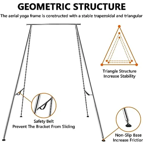 - Safe & Considerable Design: The yoga swing stand adopts overall triangular support design, it is stable and hard to fall apart. And the stand equipped with safety belt on both sides, which greatly Improve its slip resistance. The four feet also take the non-slip design. All these protection make sure our user have a safe and comfortable experience.