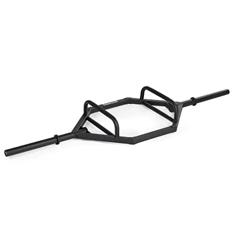 Enhance your weightlifting routine with the Titan Fitness Rackable Hex Trap Bar. This 2-inch Olympic barbell is rated for 800 LB, making it ideal for deadlifts, bent over rows, and squat jumps. The updated version features a black powder coat, medium diamond texture knurling, and Titan branded endcaps for improved grip and durability. Its unique dual handle design allows for targeting specific muscle groups, while the frame is designed to fit inside standard power racks on J-Hooks for added versatility. Elevate your strength training with this versatile and reliable trap bar.