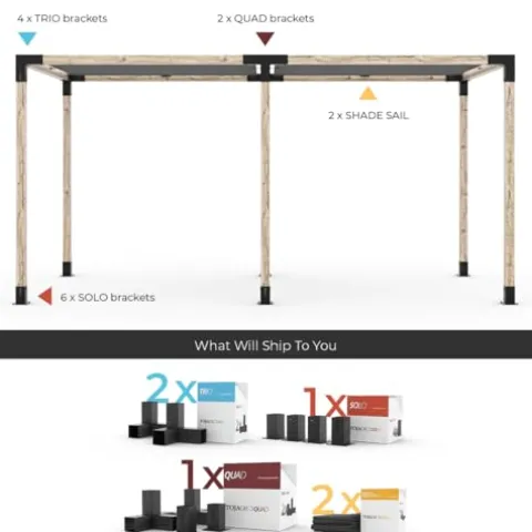 - Included: 4x TRIO corner brackets, 6x SOLO base brackets, 2x QUAD extension brackets, 2x SHADE SAIL of chosen size(s), and 1-1/2” Pan Rob/Phil combo drive 304 S.S Wood screws with Black plastic head caps.