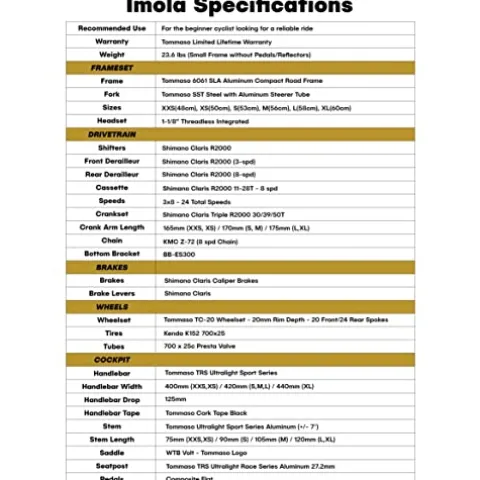 - READY TO TAKE YOUR RIDING TO THE NEXT LEVEL? Look no further than the Imola – the bike that’s built to deliver the power, performance, and speed you need to conquer your first century ride or tackle those challenging hilly routes. Equipped with a top-notch 3×8 Shimano Claris drivetrain and an impressive gearing range, this bike is designed to make climbing hills a breeze while still maintaining the speed you need to dominate on the flats.