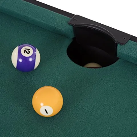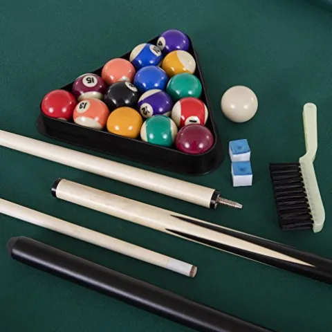 - Includes 2 red air hockey pushers, 2 red pucks, 2 48” billiard cues, full set of billiard balls, triangle, 2 chalks, and a brush