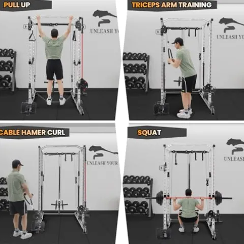 - STURDY AND DURABLE QUALITY: Made with precision cutting and powder-coated finish, this home gym equipment features 2″ x 2″ posts, making it compatible with most cage accessories on the market. Dimensions: 68″(L) x 70″(W) x 86″(H). Assembled weight is 203 lbs. After thousands of weight tests, we ensure this equipment can safely withstand up to 2000 lbs.