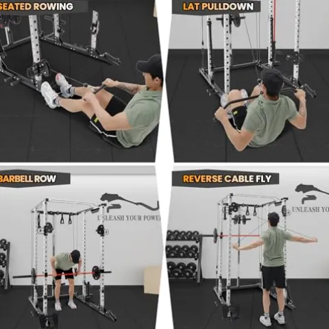 - COMPLETE AND PRACTICLE ACCESSORIES: No need to purchase additional fitness accessories. This squat rack comes with a full set of accessories to help you exercise easily. We provides 23 free attachments, 2 Nylon Safety Straps, 2 J hooks, 2 Dip bars, 4 Resistance Band Pegs, a Lat Pull Down Bar, a Cable Bar, a 360 degree Detachable Landmine, a Ankle Strap, a Tricep Rope, 2 Cable Handles, a Chain, 4 Weight Holder Clips, 1 footboard.