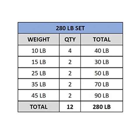 - Includes: (4) 10 lb bumper plates, (2) 15 lb bumper plates, (2) 25 lb bumper plates, (2) 35 lb bumper plates, and (2) 45 lb bumper plates. Total bumper plate set weight: 280 lbs
