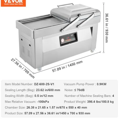 - Premium Vacuum Effect: With a powerful motor boasting a max 4510W power and a max relative vacuum of -100KPa, our chamber vacuum sealer ensures a strong vacuum effect. Featuring a chamber size of 26.38 x 21.65 x 1.57 in/670 x 550 x 40 mm, 23.62 in/600 mm sealing length (bag), and 1200W sealing power, it keeps your food fresh and flavorful. Plus, it operates quietly at less than 70 decibels.