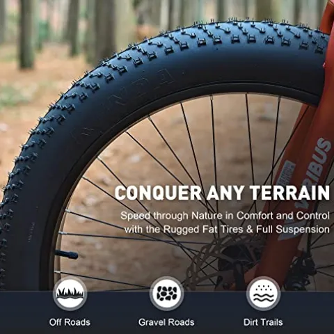 - Full Suspension Fat Tire Mountain Bike: The VIRIBUS fat tire mountain bike features a 26-inch wide wheel, making it suitable for various terrains such as sand, snow, mud, and rocky roads. It provides a comfortable and stable riding experience, even on uneven surfaces.