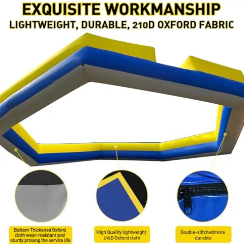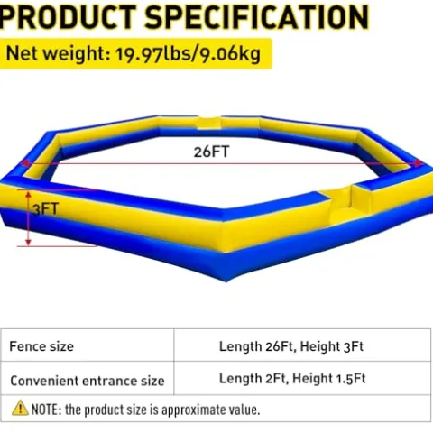 Elevate your sports activities with the WARSUN Giant 26Ft Gaga Ball Pit Inflatable, a vibrant blue and yellow court designed for endless fun indoors or outdoors. Constructed from high-strength 210D Oxford material with a thickened bottom, this durable inflatable offers a convenient alternative to traditional wooden pits. Its innovative heptagon structure provides stability while the built-in blower ensures quick and easy setup. Safety is a priority with its rounded edges and shock-absorbent design, minimizing risk during play. Perfect for camps, schools, and family gatherings, this versatile gaga ball pit promotes active play and teamwork. Enjoy hassle-free use with humanized details such as D-shaped rings for easy fastening and a notched entry for smooth access. Keep the air blower running for continuous enjoyment and create memorable experiences with friends and family.