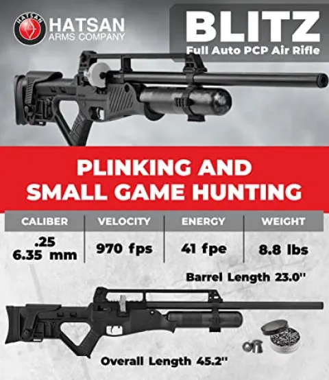 - IN THE BOX: 1 x Hatsan Blitz Full Auto PCP .25 Cal Air Rifle; 1 x Pack of 100x Paper Targets; 1 x Pack of 150x .25 Cal Pellets