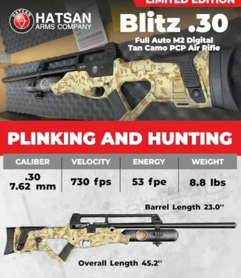 - In The Box: 1x Hatsan Blitz Limited Edition Full-Auto .30 Cal PCP Air Rifle; 1x Pack of Air Rifle Pellets; 1x Pack of Targets.
