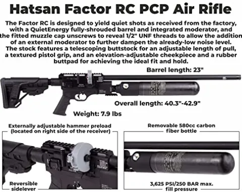 - In The Box: 1x Hatsan Factor RC PCP .22 Caliber Air Rifle; 1x 3-9X40AO Scope; 1x Pack of 250x Pellets
