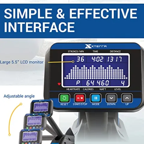 - Large 5.5″ bright blue backlit monitor with adjustable angle displays all your necessary workout information such as program profile, elapsed time, stroke count, distance, calories, strokes/min, watts, resistance level, and heart rate (chest strap not included)