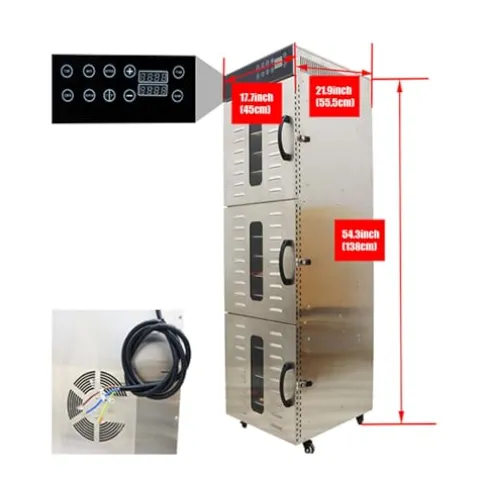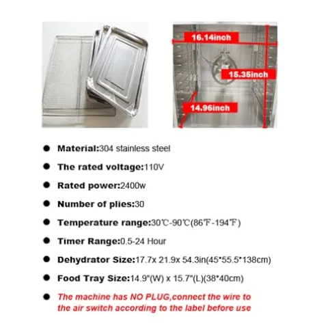 - PARAMETER:Material: 304 stainless steel; Voltage:110V;Power:2400W;Number of plies:30;Temperature range:30℃-90℃(86℉-194℉);Timer Range:0.5-24 Hour;Dehydrator Size: 17.7x 21.9x 54.3in;Food Tray Size: 14.9″(W) x 15.7″(L)