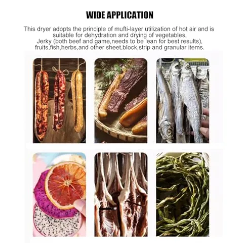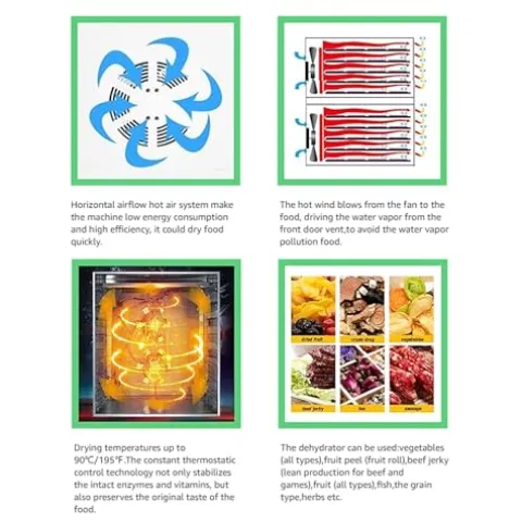 - HIGH EFFICENCY:The horizontal airflow hot air system ensures low machine energy consumption, high efficiency, and faster food drying.