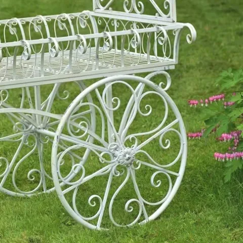 - This flower cart is an excellent display piece for your home, garden, wedding, or store. The cart is made entirely out of metal and is powder coated to allow for both indoor and outdoor use. You can put things on display in the cart body, and even hang things from the mesh roof which offers tons of space for hooks/hangers. Some of the various things you can display in it include flowers, candies, cakes, or clothes, etc.