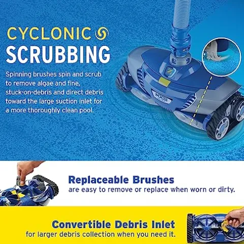 - Cyclonic Scrubbing Brushes: Spinning brushes that constantly spin and scrub to remove algae and fine, stuck-on-debris while directing debris toward the large suction inlet for a more thoroughly clean pool.
