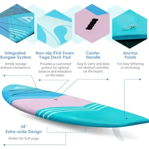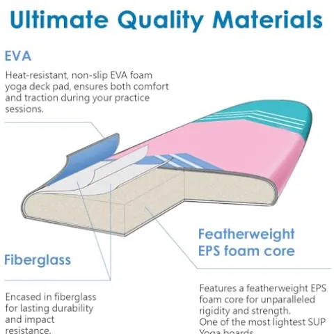 - Ultimate Quality Materials – Our standup paddle board features a featherweight EPS foam core for unparalleled rigidity and strength, encased in fiberglass for lasting durability and impact resistance. Topped with a heat-resistant, non-slip EVA foam yoga deck pad, our paddle board ensures both comfort and traction during your practice sessions.