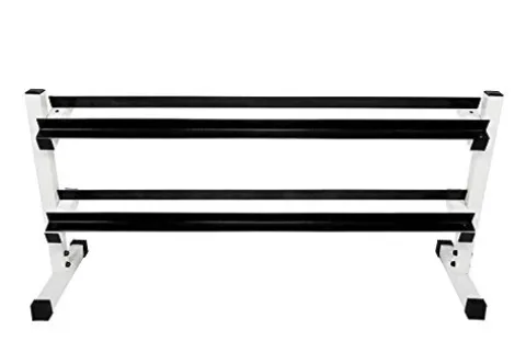 - 2-Tier 54″ dumbbell rack with durable black and white powder coating and heavy gauge steel tubing and angle steel with all side welding