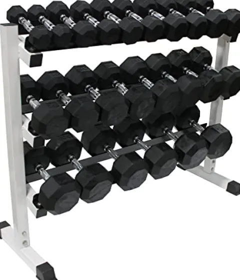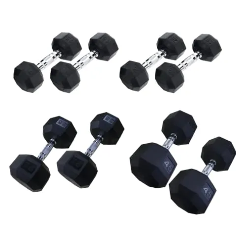 The Ader Black Rubber Dumbbell Set is a comprehensive collection of 11 pairs of dumbbells ranging from 2 to 65 lbs, totaling 540 lbs. These premium quality dumbbells feature contoured chrome handles and rubber-coated heads for a comfortable and secure grip. The set comes with a sturdy 3-tier 48″ rack with a durable black and white powder-coated frame, providing convenient storage and organization. Additionally, a 4’x5’x1/8″ rubber mat is included to protect your floors during workouts. Ideal for home gyms and professional settings, this set is a versatile and essential addition to any fitness routine. Note that shipping is not available to certain locations.