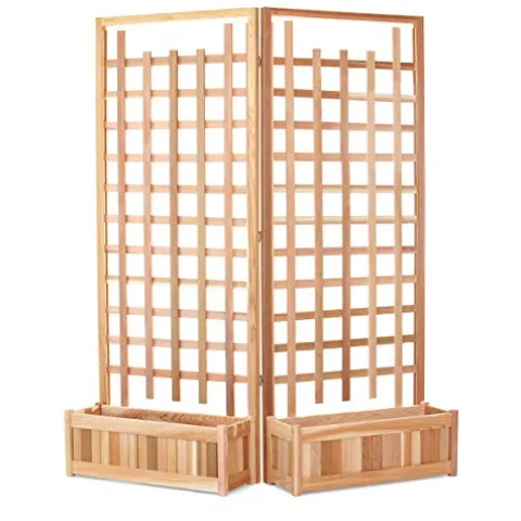 - Quality Craftsmanship: Each piece is lovingly handcrafted with precise, snug-fitting parts and a smooth sanded finish. This dedication ensures not only effortless assembly but also a polished look that complements the tranquility of your outdoor haven. Trellis dimensions: 66w x 11d x 84h. Planter dimensions: 33w x 11d x 12h.