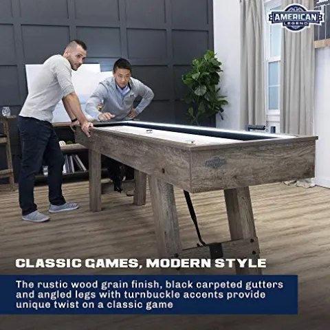 Enhance your game room with the American Legend Brookdale 9’ LED Light Up Shuffleboard Table with Bowling. This table combines classic pub gameplay with modern features, boasting light-up LED rails for an exciting twist. Its rustic wood grain finish, grey carpeted gutters, and angled legs with turnbuckle accents offer a stylish touch to your space. Enjoy two games in one with the included bonus bowling game set. Experience smooth gameplay with the shuffleboard powder that reduces friction and ensures a seamless gliding experience. Elevate your entertainment with this versatile and visually appealing shuffleboard table.