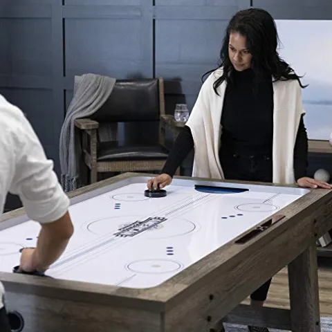 Experience the thrill of arcade-style hockey in the comfort of your home with the American Legend Brookdale Air-Powered Hockey Table. This table features a rustic wood grain finish, angled legs, and turnbuckle accents for a timeless aesthetic. The strong air blower motor ensures fast-paced gameplay, while the built-in control panel allows for quick and easy game setup. With electronic scoring and in-game sound effects, you can keep track of the action with ease. This table comes complete with two pushers and two pucks, making it ready for endless hours of fun competition.