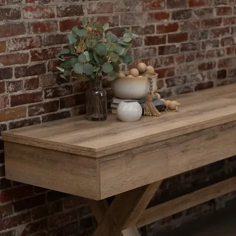 - TRANSITIONAL STYLING – Distressed white oak laminate, featuring a modern x-leg design, seamlessly blends into a variety of home décor settings, including game rooms, basements, and living rooms.
