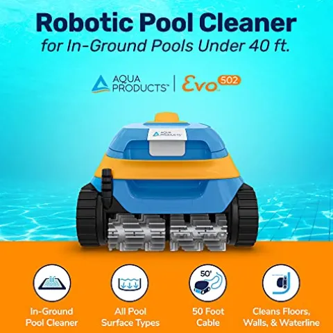 The Aqua Products Evo502 Robotic Pool Cleaner is your ultimate solution for hassle-free pool maintenance. Engineered for inground pools up to 40 feet, this multicolor marvel effortlessly climbs walls and navigates the waterline, tackling dirt with ease. Equipped with Patent-Pending Split Format brushes, it delivers double scrubbing power to ensure no surface is left untouched. Choose between two cleaning modes for floor-only or full coverage, catering to all pool surfaces including vinyl, fiberglass, and tile. Its powerful vacuum technology captures dirt in a 4-liter EZ-clean filter basket, maintaining maximum suction and preventing debris from settling. Complete with a 50-foot cable and easy-to-clean features, the Evo502 is designed to make your pool cleaning experience efficient and effective.