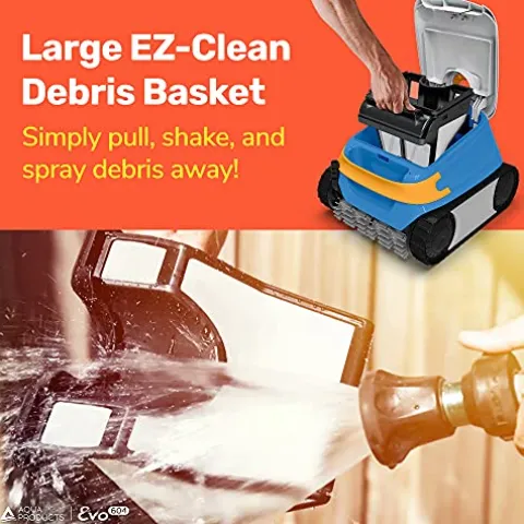 - WHAT’S INCLUDED: The Evo 604 Robotic Pool Cleaner comes equipped with a 60ft cable w/ tangle-less swivel, brushes on the front and back, and a large EZ Clean debris basket